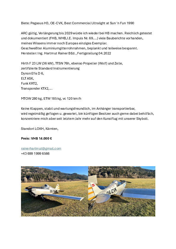 Habe vor einigen Jahren die Minimax OE-VCB von Gerhard Veigl übernommen. Das LFZ hat eine gültige Erprobungsbewilligung. Für eine endgültige Zulassung fehlt noch das Lärmzeugnis. Leider habe ich ich für längere Zeit das Medical verloren. Zum herumstehen ist es zu schade! Würde den Flieger günstig anbieten!!! Zu besichtigen in LOAV.